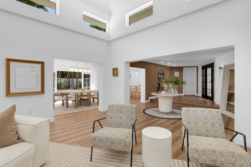 Vaulted ceilings, sumptuous wallpapers, custom wood paneling, and gorgeous details throughout. This 3,962 sq. ft. home features wood-look porcelain tile flooring, a brand-new kitchen, impact glass windows, and a new front door, driveway, and fencing. EV charging station and automatic exterior lighting included.